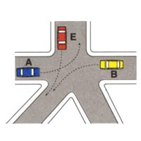 [24005_03] Nell'incrocio rappresentato in figura il veicolo E ha diritto di precedenza sul veicolo BCategoria: 14. Esempi di precedenza (ordine di precedenza agli incroci)Vero
