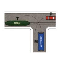 [24039_06] Nell'intersezione in figura, il veicolo T può passare per primo, purché il veicolo M non stia svolgendo un servizio pubblico di lineaCategoria: 14. Esempi di precedenza (ordine di precedenza agli incroci)Falso