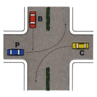 [24042_07] Secondo le norme di precedenza nell'incrocio rappresentato in figura i veicoli P e C transitano contemporaneamenteCategoria: 14. Esempi di precedenza (ordine di precedenza agli incroci)Falso